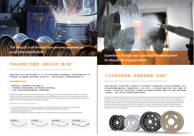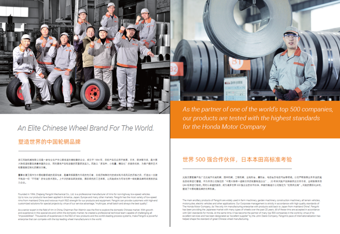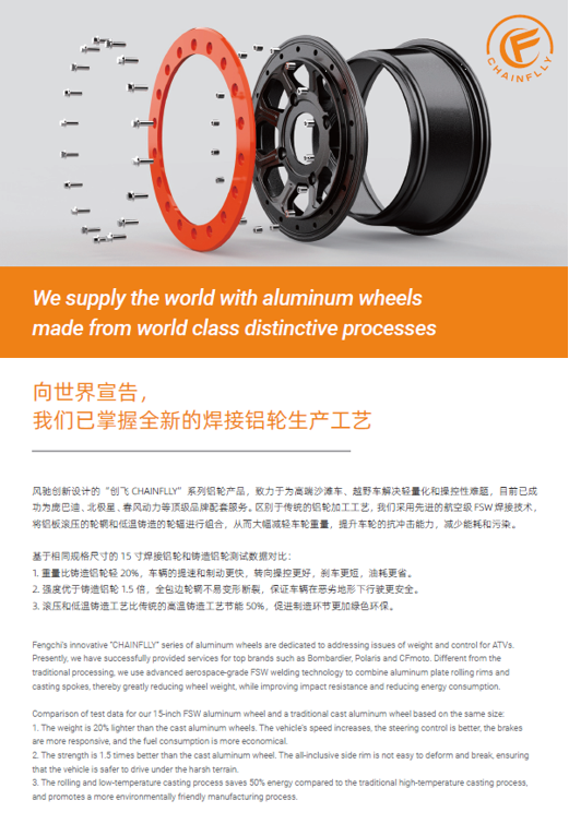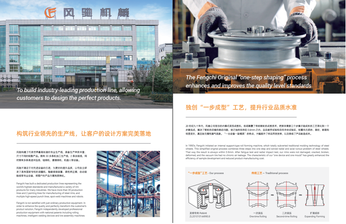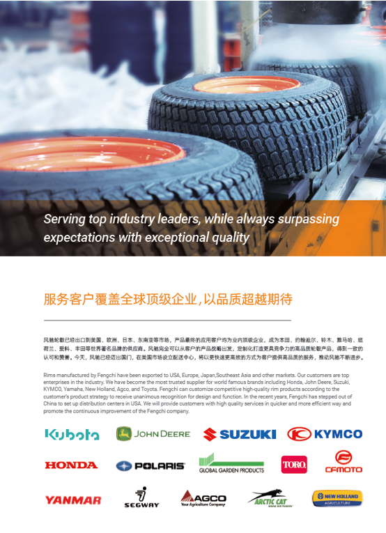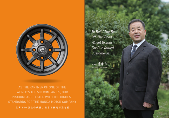 浙江風馳機械有限公司,成立于1994年,伴隨著時間的飛逝,一直以工匠精神專注生產非公路低速車輛輪轂,在董事長潘衛民的英明帶領下,風馳以自信、沉穩、堅實的腳步,企業逐步成為了世界500強合作伙伴、申請了企業獨有的輪輞品牌、創立了旗下5家子公司、獨創特殊工藝、產品革新換代,一直以實現“引領低速車輪發展,為中國制造正名”的使命及成為“全球知名低速車輛制造企業的最佳戰略合作伙伴”為愿景而一直努力著。