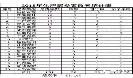 2018年,生產(chǎn)部各車間合計提案改善131件,完結(jié)70件,推進(jìn)中53件,不予采納8件。大家的提案,涉及到生產(chǎn)管理的方方面面,非常廣泛。