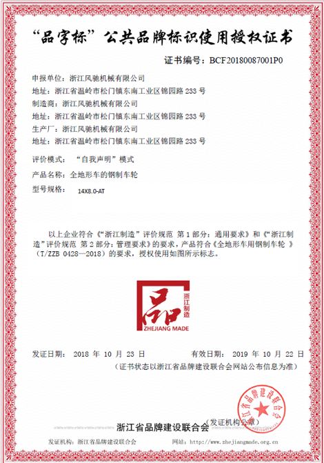 我司是在去年積極響應浙江制造品牌建設,在完成上一階段浙江制造團體標準《全地形車用鋼制車輪》(T/ZZB 0428-2018)的申報、審批與發(fā)布實施后,在此基礎之上,于2018年9月份申報了“品字標公共品牌標識”,通過“自我申明”評價模式及資質審核,順利通過評審,獲得了“品字標”公共品牌標識使用證書。